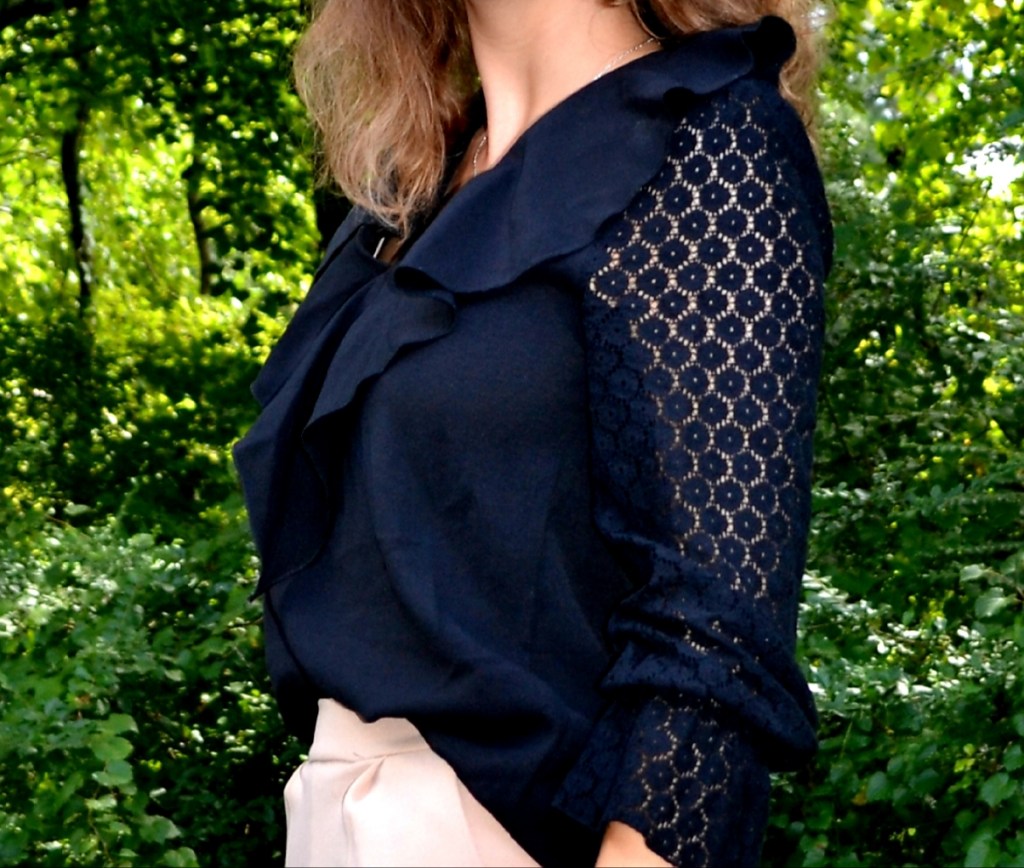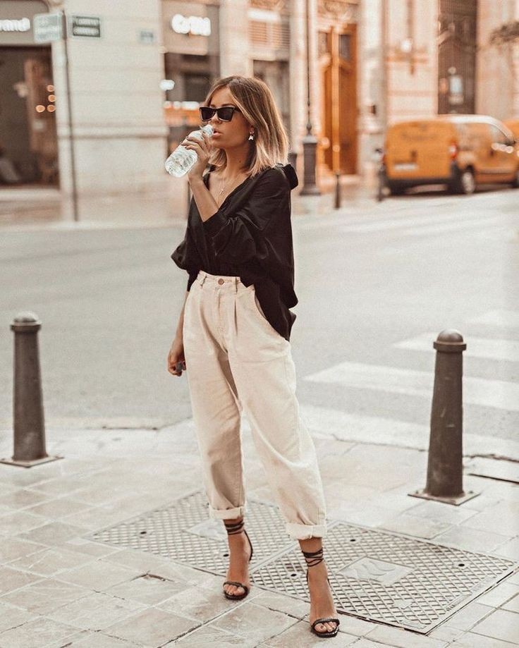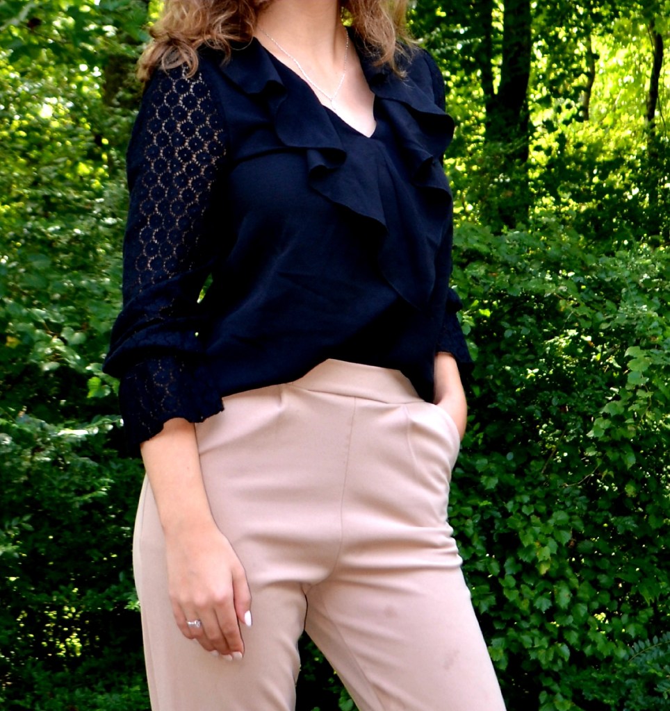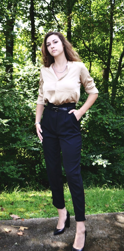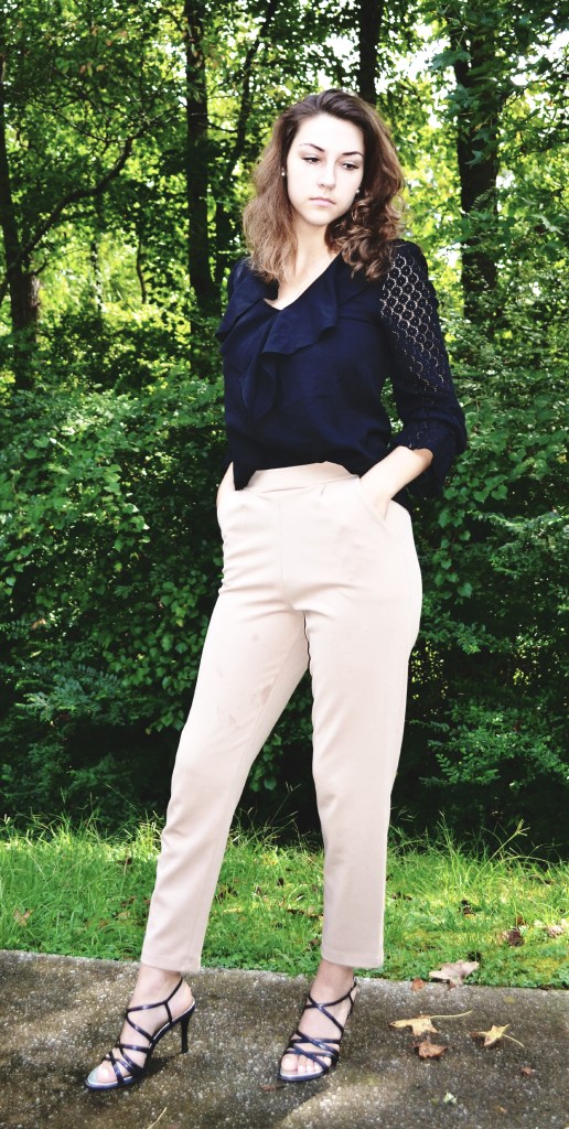 I decided to use the inspiration of color and theme in my outfit recreation. I copied the colors as similarly as I could using existing items in my wardrobe. The themes I drew from the inspiration image was loose fitting, relaxed clothing. The top is loose and free which is especially seen in the ruffled collar detail. I chose to only tuck in the front of the shirt, just like in the image from Pinterest. The pants are fitted in the waist and relaxed in the leg just like in the image. I did my best to mimic the jewelry as well. She has on some dainty layered chains. Instead of layering necklaces, I decided to wear my dangly silver one which mimics a similar aesthetic. I paired some strappy black heels with this outfit, and voila! My outfit recreation is complete!