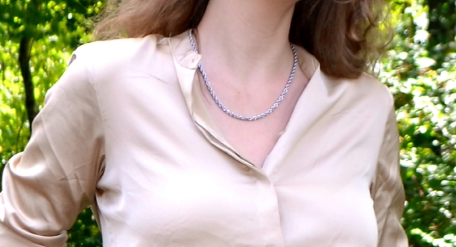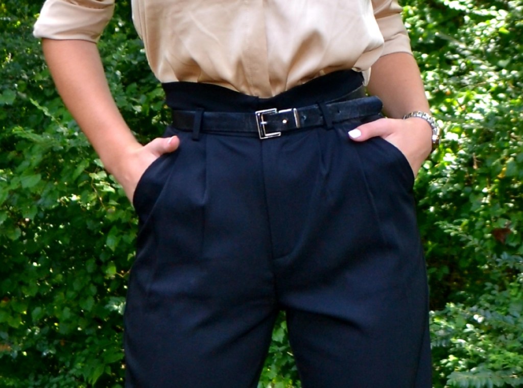 For this outfit I played off of the textures and structures of the inspiration image. I chose to wear a relaxed, silk shirt. I don’t own one in the beautiful green color that you see above, so I opted for a similar style cream button up. In contrast to the relaxed flowy shirt, she has on some more structured trousers. I mimicked this, this time also playing off of the same color as the image. I decided to wear a thin black belt instead of trying to recreate the croc embossed, thick belt from the image. The black blends more seamlessly, creating one long line from waist to feet where I have on a pair of pointed toe, chunky heels. I made this choice with the belt because of the contrasting color in my choice of shirt. In the inspiration image, she has chosen a dark shade for her shirt and bottoms, creating the appearance of height and elongation. Adding the belt for her does not disrupt this line. Because I have a contrasting color on top, adding a different color belt would end up making me look shorter regardless of the high waisted pants and pointed toe heels which give the illusion of longer legs. I added a chunky chain and watch to accessorize, just like in the inspiration image.