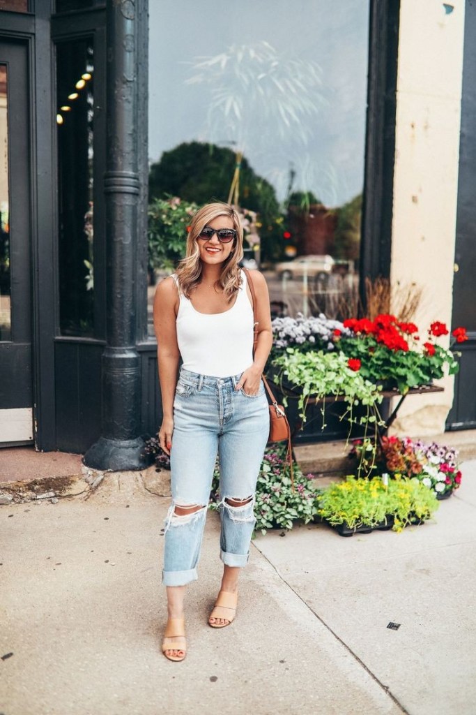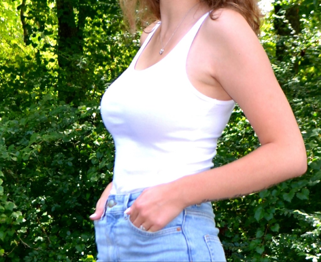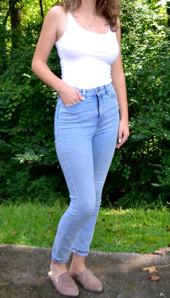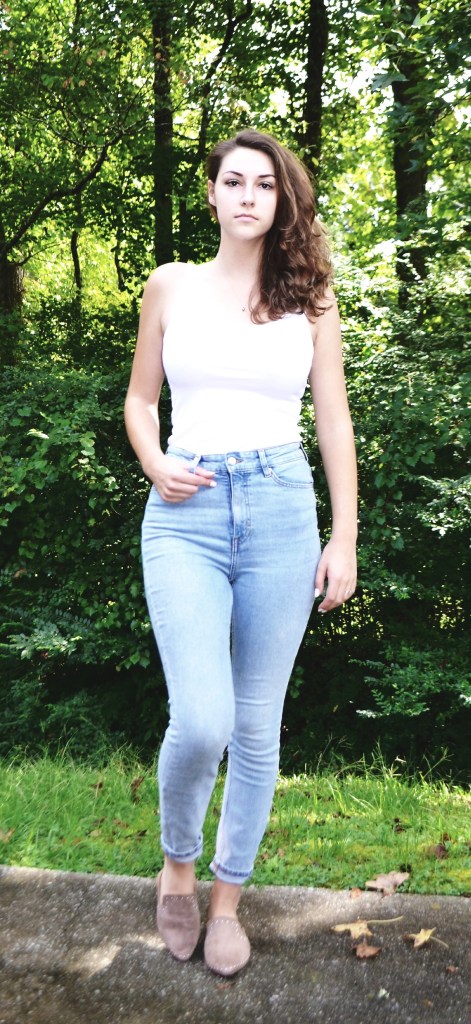 I chose this image because I think it is a really easy outfit to recreate. There are only 2 basic elements in this image; the white tank top and the light wash denim jeans. I could have pulled different themes from this than what I chose to create but I think almost anyone and everyone owns a basic white tank and some light wash denim (and if you don’t, you should, they are basics!). I paired a very dainty pendant with this outfit and some slide on loafers. I could’ve added a bag and glasses like the image but I wanted to keep things extremely simple.